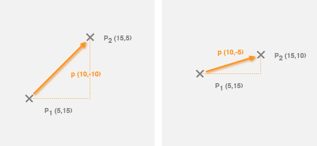Ein Vektor gibt uns also an, wie wir von einem Punkt zum nächsten gelangen. Zum Beispiel: Gehe in x-Richtung 10 Schritte und in y-Richtung -10 Schritte…