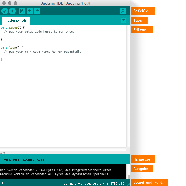 Um Programme für das Arduino zu schreiben, verwendet man eine integrierte Programmierumgebung (IDE), welche von David Mellis entwickelt wurde und sich stark an Processing orientiert. Dies macht uns den Einstieg besonders einfach – es gibt jedoch einige Unterschiede, wenn wir für einen Mikrocontroller programmieren. Für Arduino verwenden wir eine vereinfachte Variante von C/C++. Da Arduino auf Processing aufbaut sieht die Oberfläche und die Syntax beider Programme sehr ähnlich aus. Auch die Programmierumgebung sieht sehr ähnlich aus.