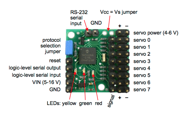 Mit dem Polulu Servo Controller können bis zu 8 Servos gleichzeitig angesteuert werden. Zusätzlich können die Servos einfach mit einem externen Netzteil gespiesen werden.