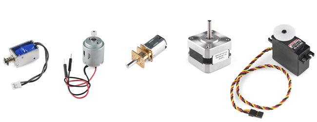 Actuators are electromechanical components that translate electrical current into physical or mechanical energy (motion or pressure). On this page, we will also consider other transducers that translate electrical energy into light, heat or some other physical phenomena. In a sense, outputs can be seen as the opposite to sensors, which translate physical or mechanical quantities into electrical impulses. In many cases inputs (sensors) and matching output are based on the same principles and some devices can even work as both inputs and outputs. To give us an overview, we divide the outputs we use into different groups. Many of the actuators presented here require more voltage and current than an Arduino can supply at an output. Therefore it is recommended to use either a transistor as switch (when working with DC current) or a relay as switch (when working with mains voltage), or a dedicated driver circuit.