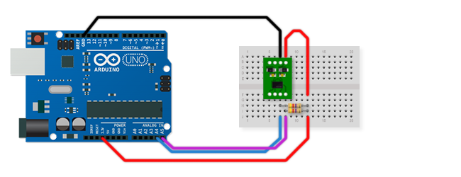 The connection of the accelerometer (MMA 7455L) is relatively simple. The i2c interface requires only two lines (Analog4/SCL and Analog5/SDA) of which one serves the clock and one the data. To ensure communication, a pullup resistor to VCC (3.3V) must be added to each of the SCL and SDA lines. The sensor runs with 2.4-3.7V which is why we connect it to the 3.3V output of the Arduino. GND is connected to the GND of the Arduino as usual.