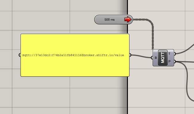 Place an MQTT and a Timer component on to the canvas. The Broker URI input should recieve the URI for your shiftr.io key.
