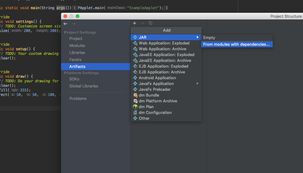 5. To export a clickable java application, you will need to set up artefacts. Go to →File→Project Structure and then click on the Artefacts tab. Click the + icon and add a new JAR 'From modules with dependencies...'. In the next dialogue box, select ExampleApplet.java as the main class file and click ok.