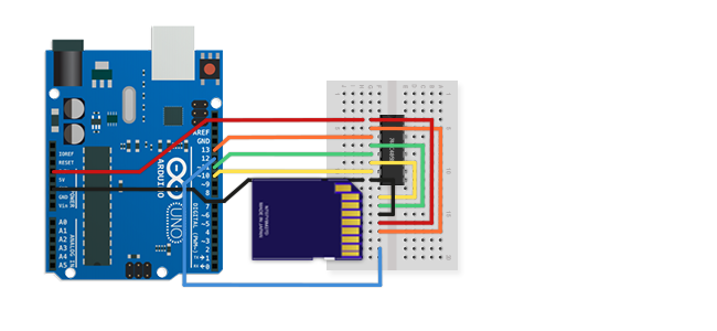 Der Zugriff auf die Karte erfolgt via SPI Interface (Wikipedia Link). Damit ist es möglich, die SD Karte direkt von Arduino aus zu beschreiben und auch auszulesen. Wichtig ist, dass das SPI Interface dabei mit 3.3V und nicht direkt mit 5V betrieben wird, ansonsten kann die Karte beschädigt werden.