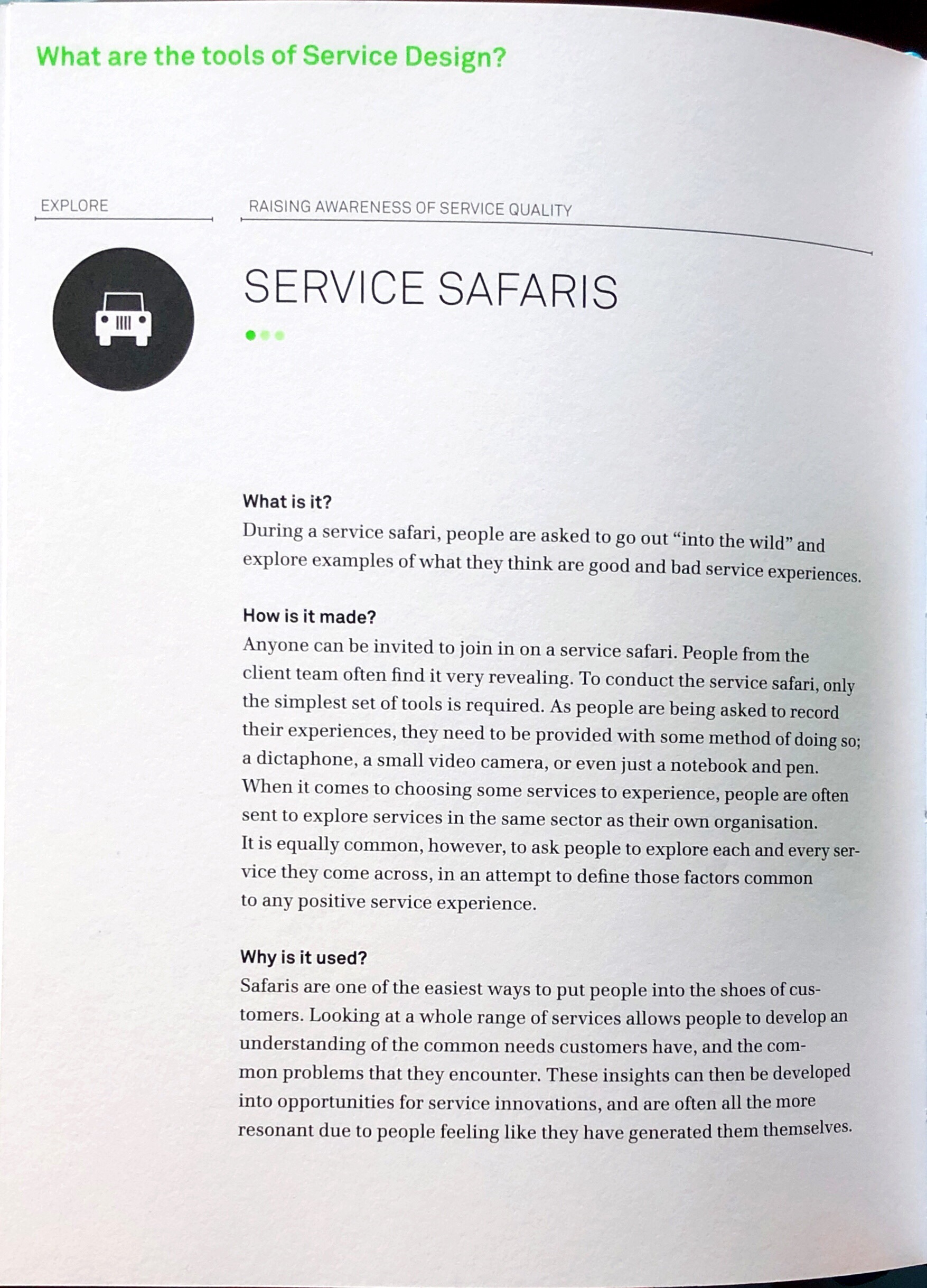 Ziel der Service Exploration ist es aufzuzeigen, wie sich Personen im Alltag mit verschiedenen Aspekten rund um das Themengebiet auseinandersetzen. Es sollen Interviews, Beobachtungen und “Mini-Experimente” durchgeführt werden. Das gesammelte Material (Fotos, Video etc.) bildet die Basis für eine anschliessende Analyse in Form einer Experience Map o.ä., auf der nicht nur die beobachtete Service/-Erlebniskette abgebildet ist, sondern auch bereits schon Ansätze für “Interventionsmöglichkeiten” aufgezeigt werden.